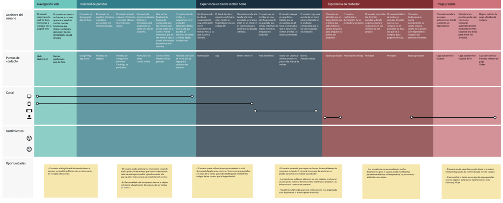 We carried an initial research on relevant data and patterns in the retail industry as well as a benchmarking of competitors and other innovative solutions. We landed on an analysis of the current Inditex proposals as a starting point for the project. Our goal was to understand the retail and services market from a human centered point of view.